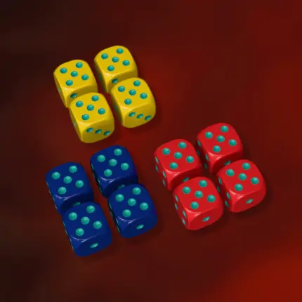 - 4 individuelle, zweilagige Spielbretter mit ausgestanzten Würfelfeldern, damit Würfel nicht verrutschen